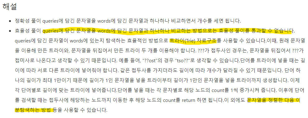 문자열 문제 - 트라이 자료구조 또는 이분 탐색등 사용해야 효율성 통과