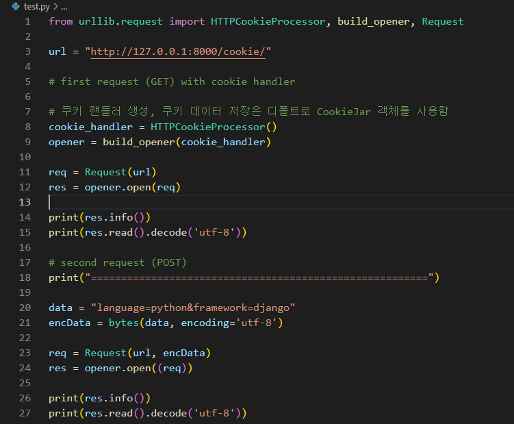 - 아래는 HTTPCookieProcessor 클래스를 사용하여 쿠키 데이터를 처리하는 프로그램임