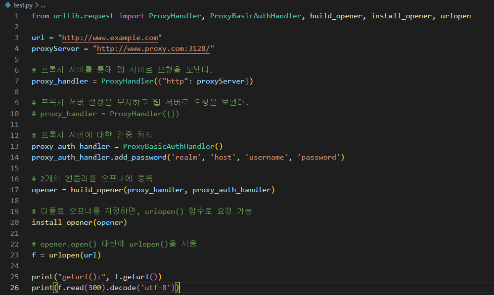 - ProxyHandler 및 ProxyBasicAuthHandler 클래스를 사용해 프록시 서버를 통과해서 웹 서버로 요청을 보내는 프로그램
