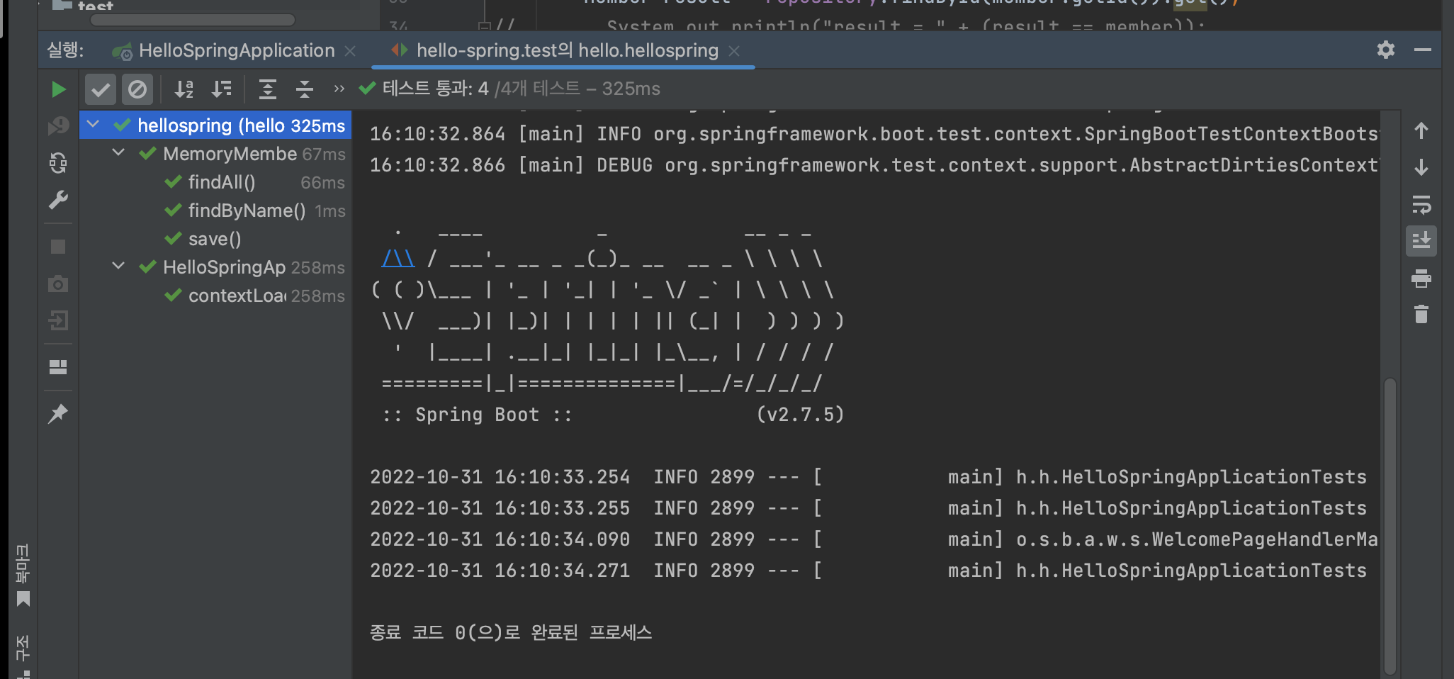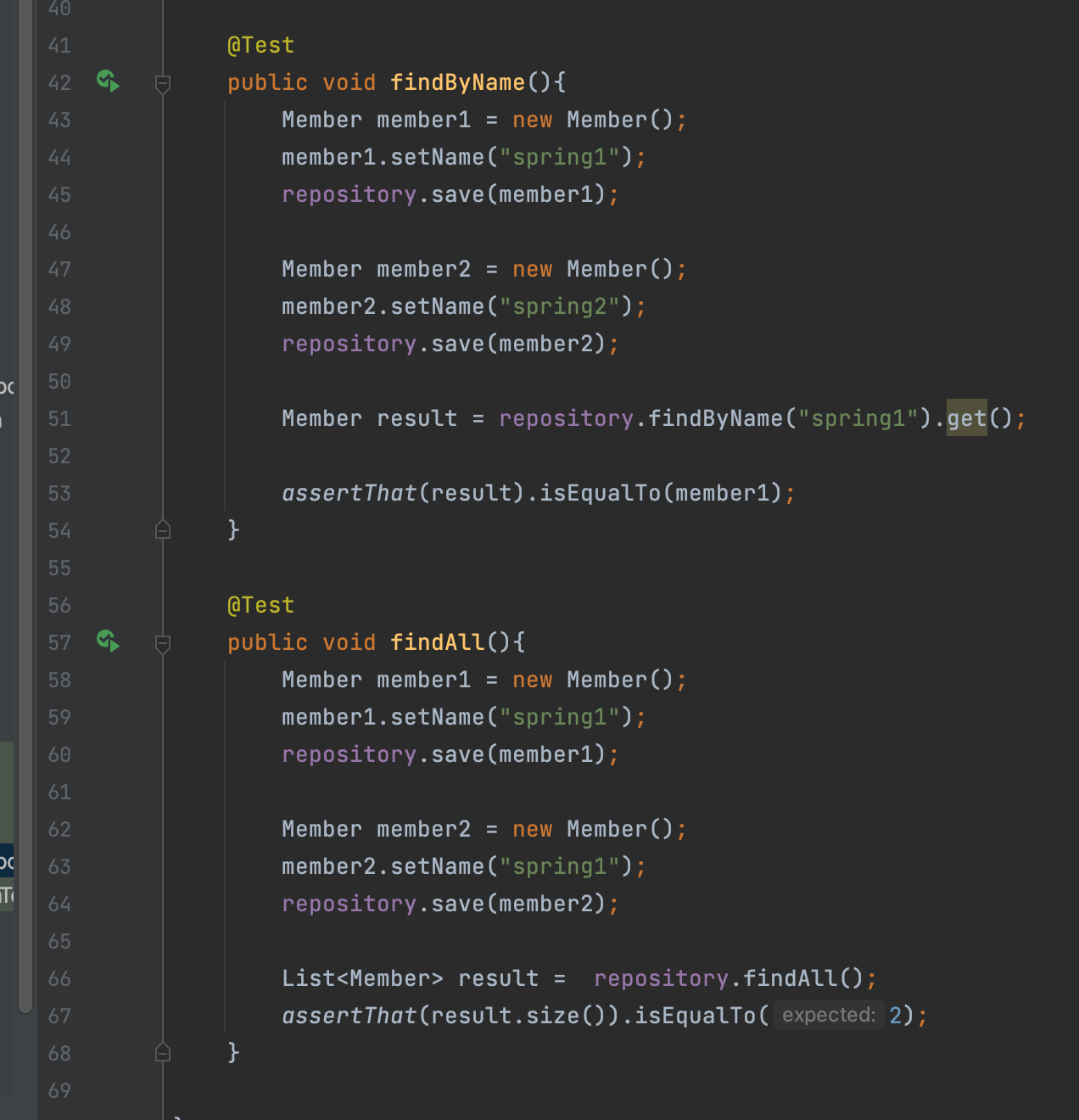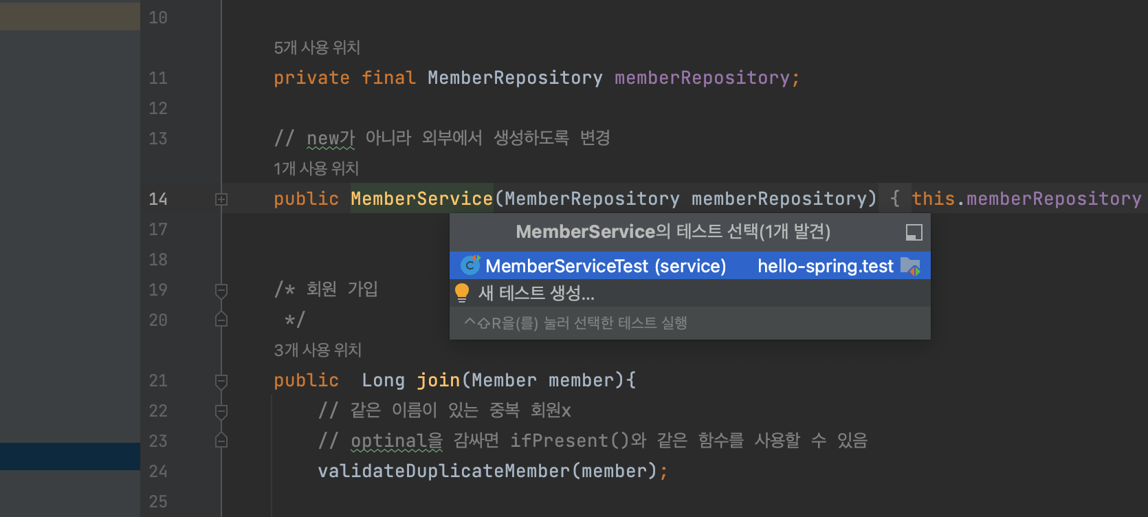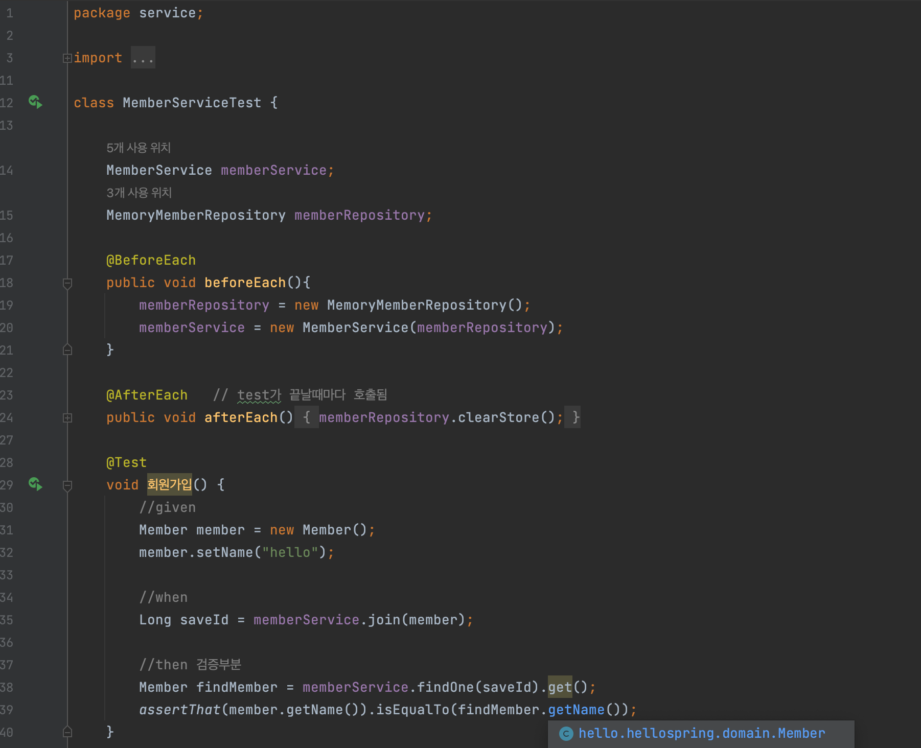 - 레포지토리 이름이 MemoryMemberRepository 였기 때문에 MemoryMemberRepositoryTest라는 이름으로 생성한 것