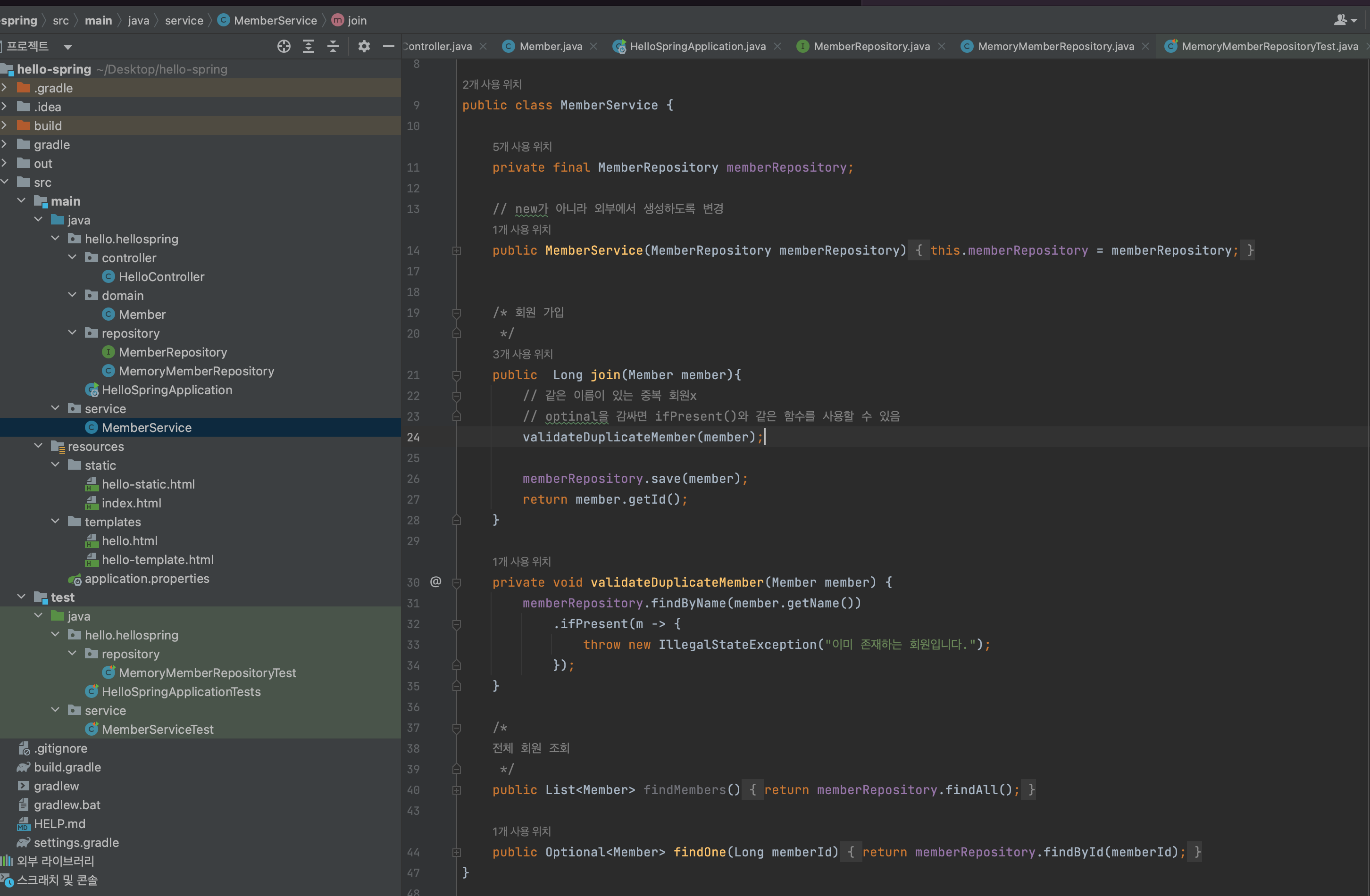 - implements MemberRepository에서 MemberRepository부분을 드래그하고 Optrion + Enter하면 구현할 클래스를 자동 생성해줌!